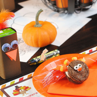 Get a few coloring sheets ready and crayons. Have a snack on their spot. It is hard for all of us to wait till dinner time. Have a turkey made out of Veggies or a small sweet treat that they will enjoy. Cover a juice box with a brown piece of paper and make a turkey face on it. See images below for some ideas. Make a treat as you wait. See the recipe below.